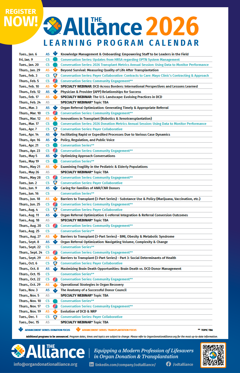 The Alliance Live Advancement Series presents more than 25 live webinar programs per year on relevant, timely topics impacting the donation and transplantation community of practice. The Alliance is not an advocacy organization and always intends to maintain an objective and unbiased perspective.